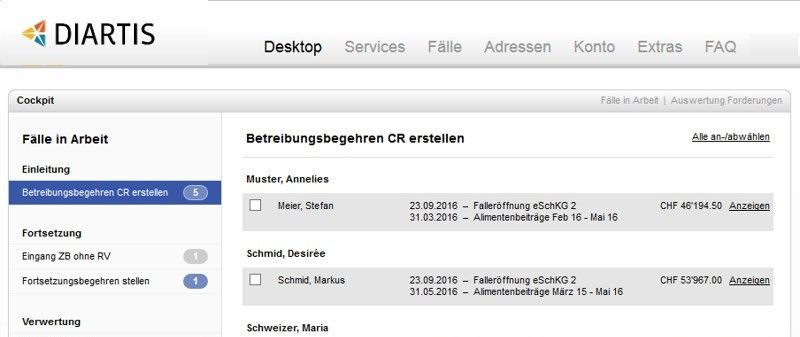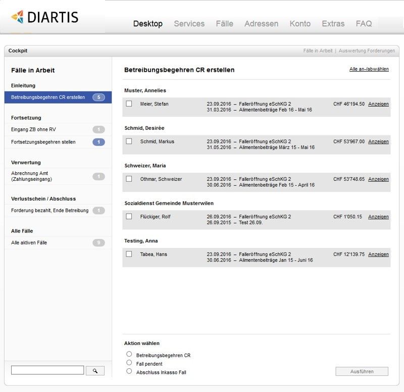 Im eSchKG-Cockpit werden die Betreibungsfälle einzeln oder en bloc bearbeitet. Die linke Spalte zeigt die Stufen im Betreibungsprozess. Im Screenshot kann in fünf Fällen das Betreibungsbegehren und in einem Fall das Fortsetzungsbegehren gestellt werden. Es genügt, die Fälle zu markieren und in zwei Klicks die Begehren auszulösen.